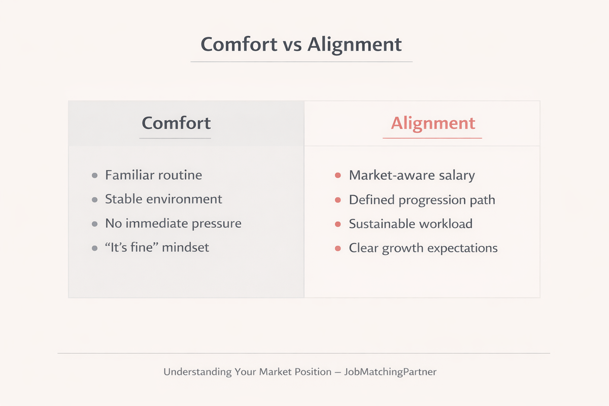 The problem is not that professionals ignore these changes. It’s that many haven’t recalibrated for them. Salary expectations are often anchored to past market conditions. Growth assumptions are based on internal promises rather than external benchmarks. So stability gets confused with alignment.